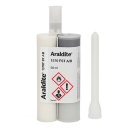 ARALDT1570FST is a 200 mL cartridge of Huntsman Araldite® 1570 FST, a two-component flame-retardant epoxy adhesive for aerospace use. It cures at room temperature and meets aviation flammability standards FAR 25.853(a), FAR 25.853(a-1), and AITM 3.0005.