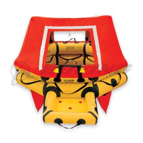 This life raft is FAA-TSO approved and designed for use at altitudes from -2000 to 45000 feet and temperatures between -40 to 140 degrees Fahrenheit. It features a fabric deck with an inflatable center float, dual boarding sides, and a canopy with roll-up doors and a rainwater collector.